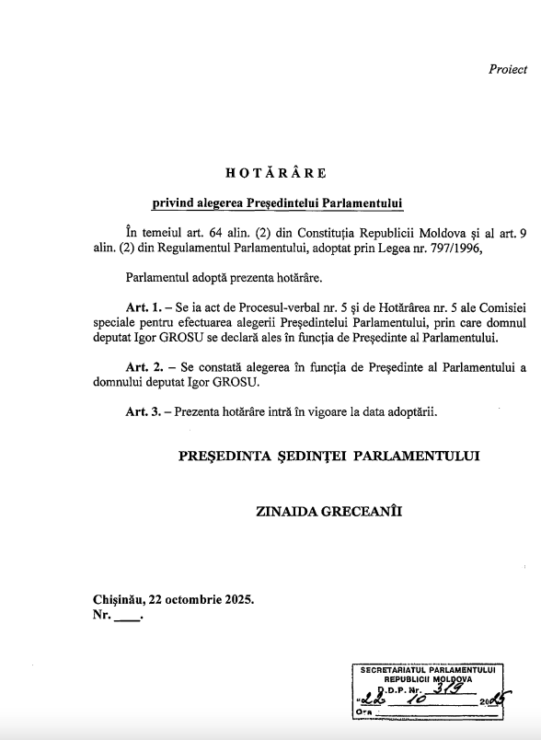 Ședința de constituire a noului Parlament, întreruptă: Igor Grosu a fost ales în funcția de președinte al Legislativului pentru încă un mandat. Partidele vor stabili în zilele următoare numărul de vicepreședinți ai instituției