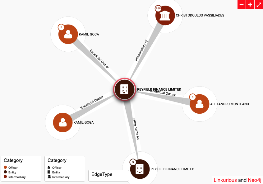 Aceeași bază de date relevă conexiunile lui Alexandru Munteanu și Kamil Goca și cu o altă firmă – „REYFIELD FINANCE LIMITED”. Aceștia sunt listați drept „beneficiari efectivi” ai offshore-ului. Firma a fost înregistrată în 2011, de asemenea, în Insulele Virgine Britanice. În „REYFIELD FINANCE LIMITED” figurează și un intermediar – Christodoulos Vassiliades, care are același rol de „intermediar” în alte peste 280 de firme offshore.