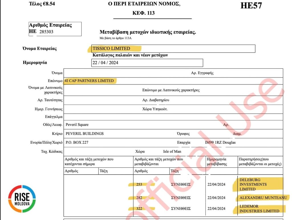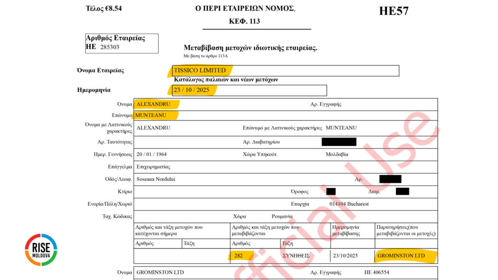Cu opt zile înainte ca Maia Sandu să investească Guvernul Munteanu, pe 28 octombrie, Alexandru Munteanu a cedat pachetul său de 282 de acțiuni din „Tissico” către o altă firmă din Cipru – „Grominston Ltd”. Și aceasta este controlată de un cetățean ceh, al cărui nume însă nu este indicat în documentele companiei consultate de RISE Moldova.