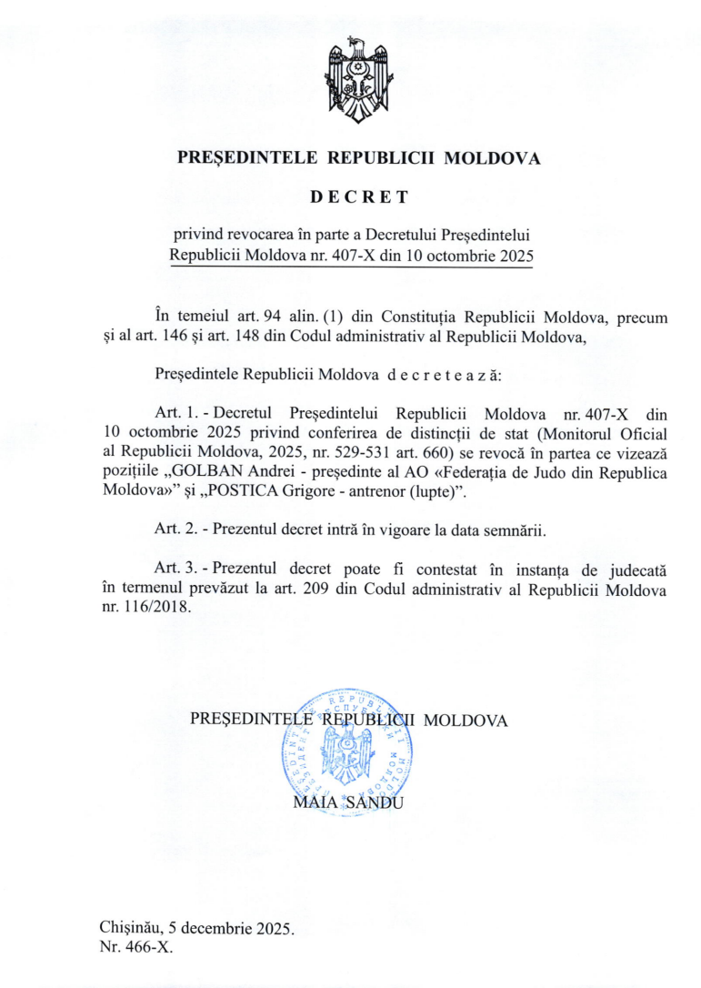 Decizia de conferire a distincțiilor de stat în cazul a două persoane: Andrei Golban, președintele Asociației Obștești „Federația de Judo din Republica Moldova”, și Grigore Postică, antrenor de lupte, a fost revocată. Președinta R. Moldova a semnat un decret în acest sens vineri, 5 decembrie.