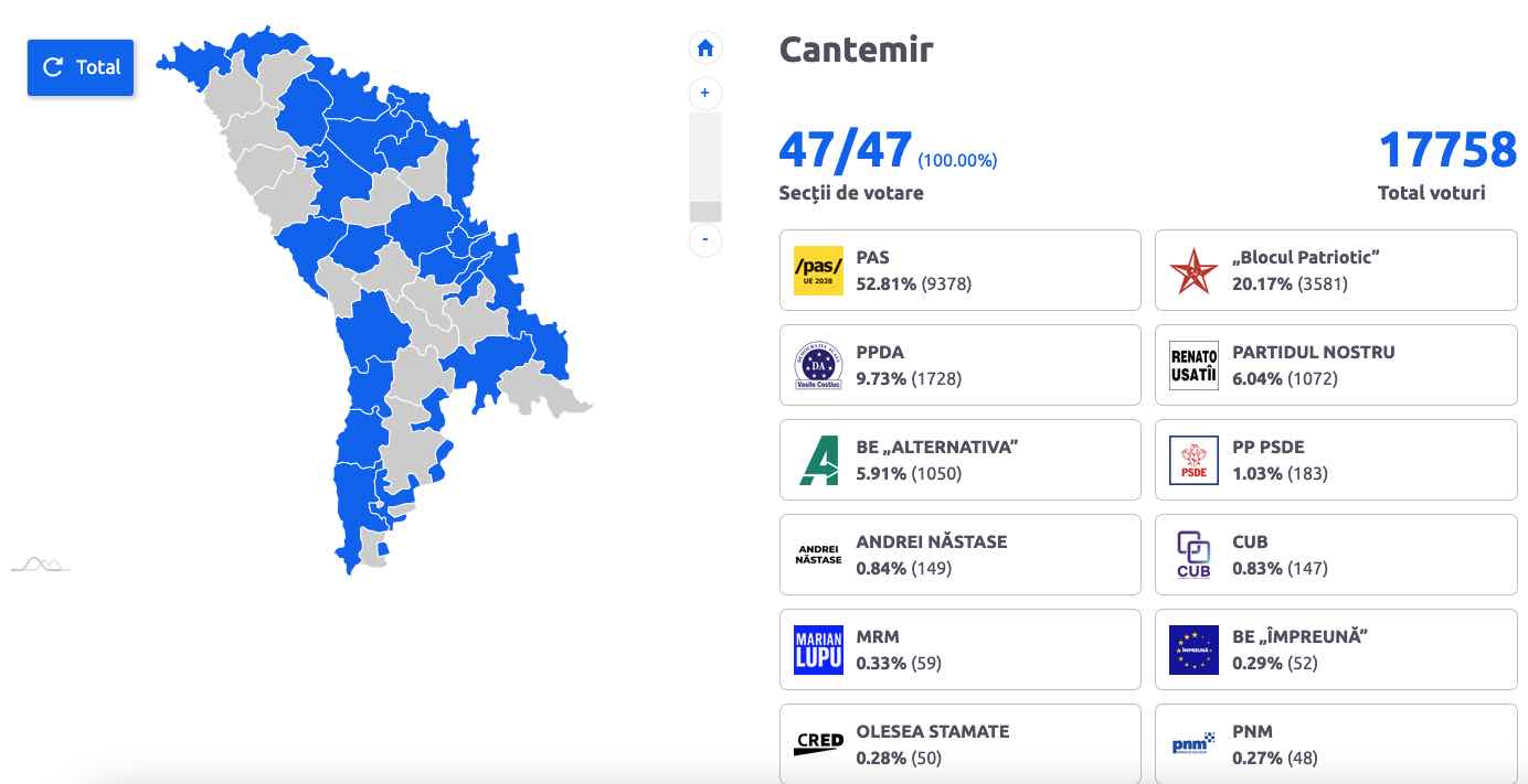 În raionul Cantemir au fost procesate toate cele 17 758 de voturi exprimate. Rezultatele indică 52,81% pentru Partidul Acțiune și Solidaritate (PAS), 20,17% pentru Blocul „Patriotic”, 9,40 pentru 9,73% pentru Democrația Acasă și 6,04% pentru Partidul Nostru.
