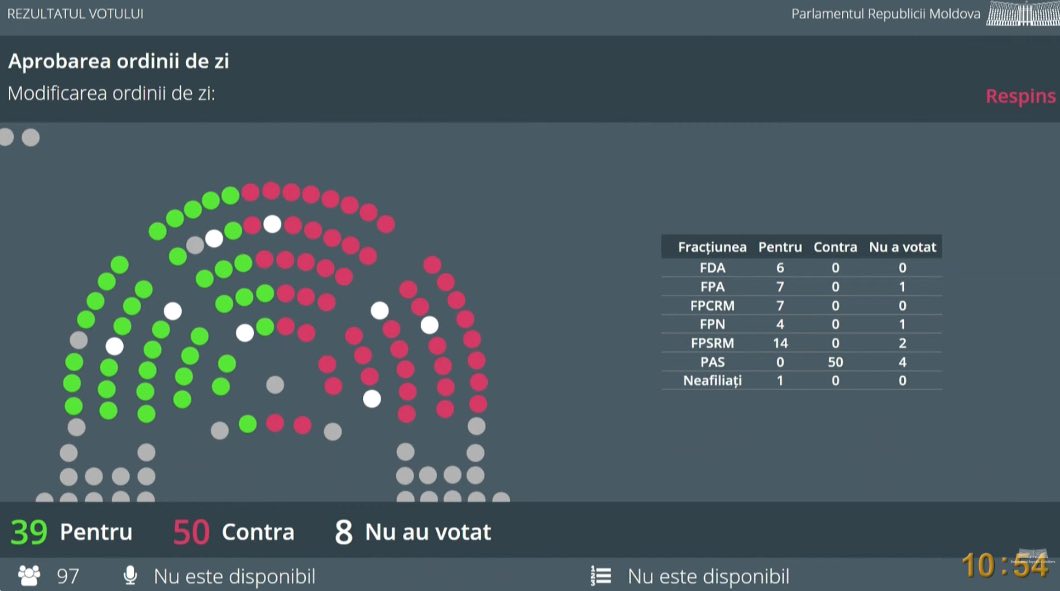 Inițiativa legislativă nu a fost inclusă pe ordinea de zi a ședinței Parlamentului din 9 aprilie. Majoritatea deputaților a refuzat examinarea proiectului înaintat de Alexandr Stoianoglo, respingând includerea acestuia pe agendă cu 50 de voturi împotrivă.