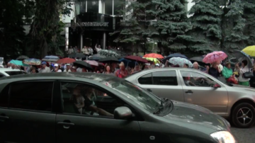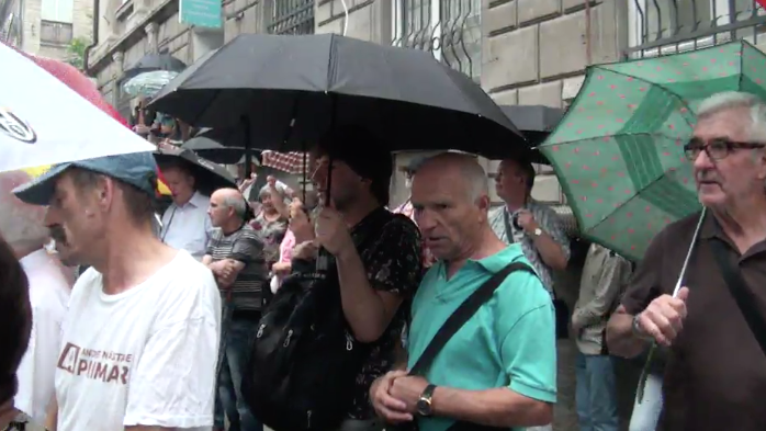 În fața clădirii CEC mai mulți protestatari scandează „Jos mafia!”, „Hoții”, „Năstase e primar!”, „Validare!”. Aceștia s-au dotat cu umbrele și continuă să protesteze în pofida ploii.