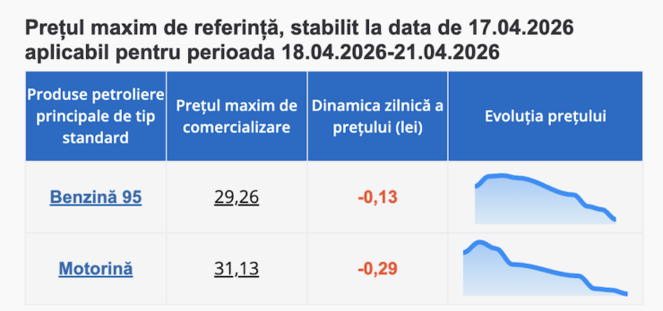 Totodată, pe 20 aprilie, benzina 95 s-a ieftinit cu 13 bani, prețul unui litru coborând la 29,26 de lei.