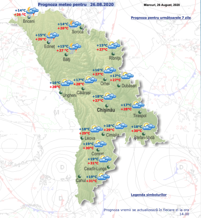 Destul de răcoare va fi și în Centru unde maximele vor ajunge la 28 de grade, însă nicio șansă de ploaie. La fel ca și în raioanele de Sud. Acolo unde, mercurul termometrelor va depăși 30 de grade Celsius.
