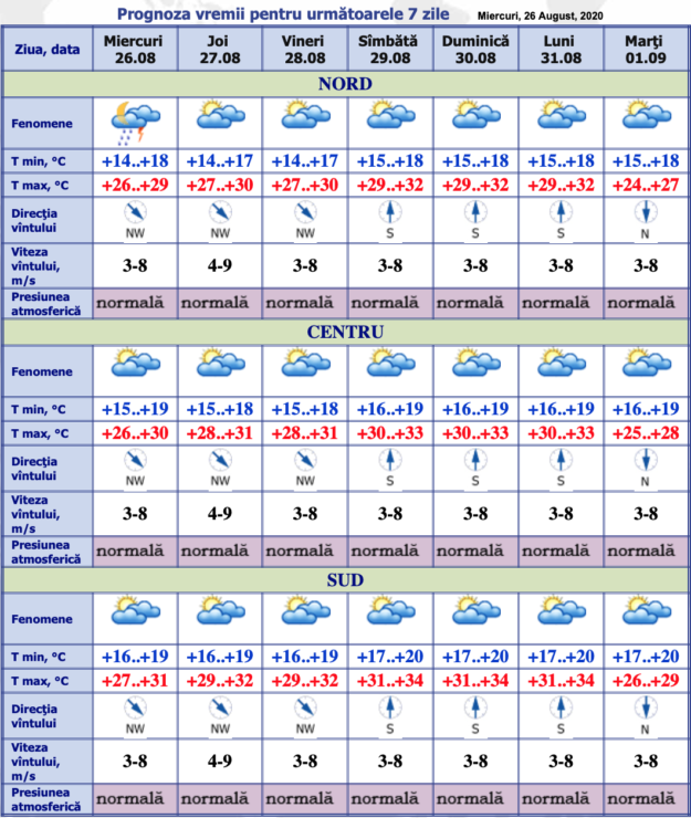 Vântul va bate cu intensificări din direcția nord-vest. Cerul va fi variabil, iar presiunea atmosferică normală. Potrivit meteorologilor, de mâine precipitațiile se vor opri, iar vremea va trece într-un proces de încălzire accentuată.