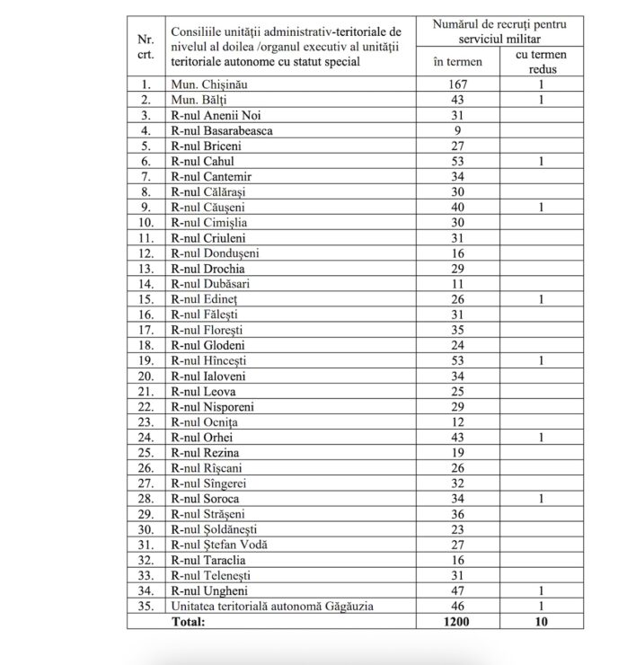 În perioada aprilie – iulie 2026 s-a stabilit sarcina de încorporare pentru serviciul militar în termen în Armata Națională până la 1200 de recruți. La fel, pentru serviciul militar cu termen redus numărul ajunge până la 10. Acest lucru reiese din hotărârea de Guvern care urmează să fie votată la următoarea ședință a Executivului, care va avea loc miercuri, 8 aprilie.