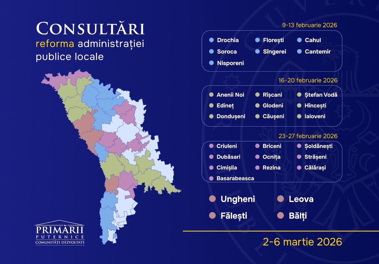 Reforma administrației publice locale a fost consultată cu cetățenii în 29 de raioane ale țării și în municipiul Bălți, în perioada 9 februarie – 6 martie 2026, anunță Guvernul. La discuțiile din ultima săptămână au participat aleși locali și cetățeni din Leova, Fălești, Ungheni și Bălți.
