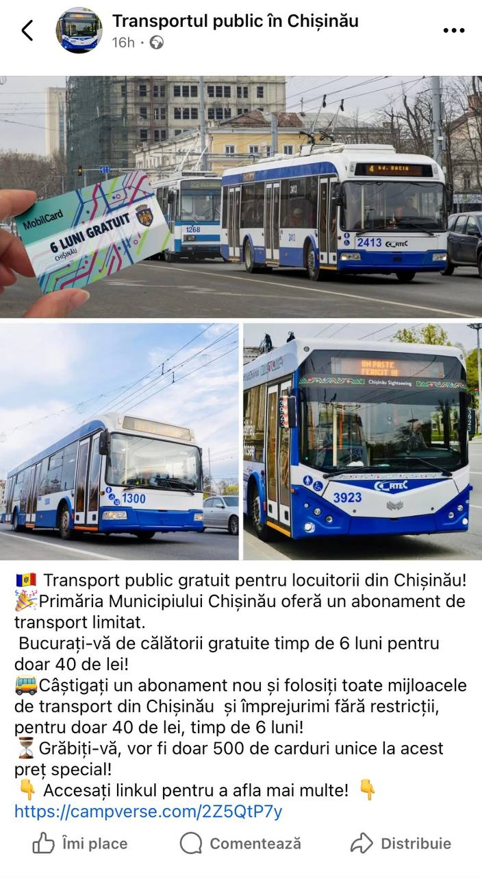 „Regia Transport Electric Chișinău aduce la cunoștința publicului că, informația care circulă pe rețelele sociale referitor la «abonamente gratuite pentru 6 luni» este falsă și nu are legătură cu instituția noastră. RTEC și Primăria Municipiului Chișinău nu au lansat nicio campanie de acest tip”, informează instituțiile.