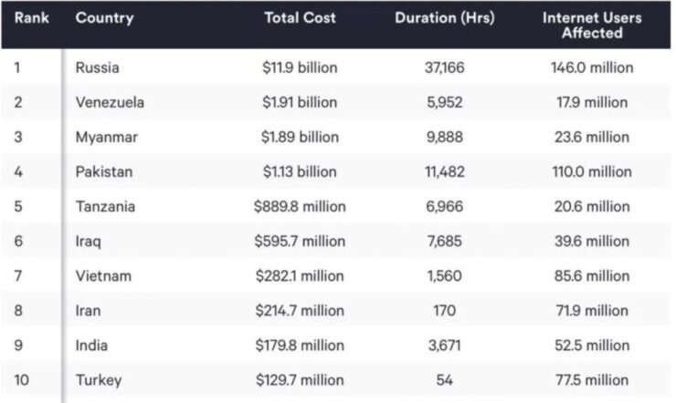 Pagubele provocate economiei ruse de „shutdown-uri”, deconectări ale internetului mobil, încetinirea resurselor și a rețelelor sociale sunt estimate de experți la 11,9 miliarde de dolari pe an (930 miliarde de ruble). Aceasta este o sumă mai mare decât toate celelalte țări din clasament la un loc (7,8 miliarde de dolari).