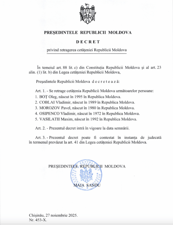„Este vorba de cinci persoane născute în țara noastră, care sunt înrolate în Grupul Operativ al Trupelor Ruse (GOTR), dislocată ilegal pe teritoriul R. Moldova”, a precizat purtătorul de cuvânt al Președinției, fără a explica care este motivul semnării decretului în privința celorlalte două persoane.