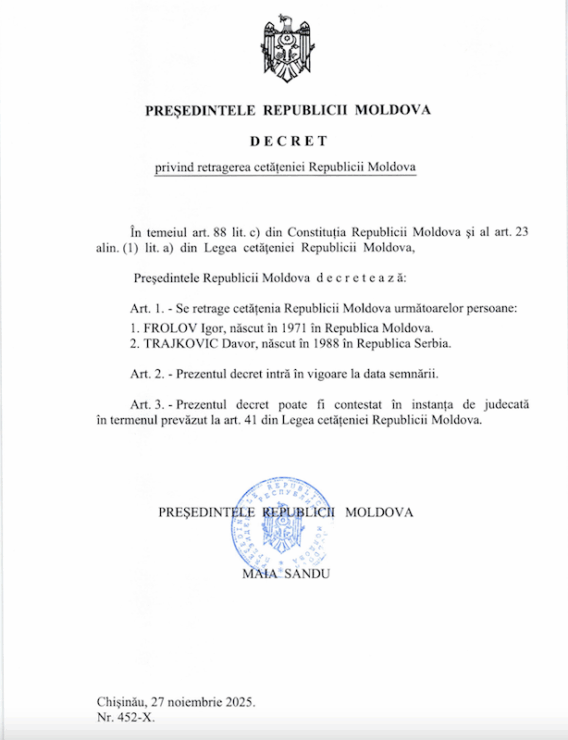 Șefa statului Maia Sandu a semnat două decrete prin care a dispus retragerea cetățeniei a 7 persoane. Potrivit purtătorului de cuvânt al Președinției, cinci dintre acestea sunt înrolate în Grupul Operativ al Trupelor Ruse.