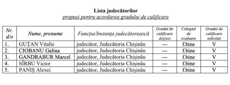 UPDATE 10.20: Se propune acordarea unor grade de calificare pentru 5 judecători de la Judecătoria Centru. Pentru că au parvenit unele informații suplimentare despre 4 magistrați, membrii Consilului a decis amânarea examinării demersului lor. În același timp, CSM a votat pentru acordarea gradului V de calificare pentru judecătorul Vitalie Guțan.