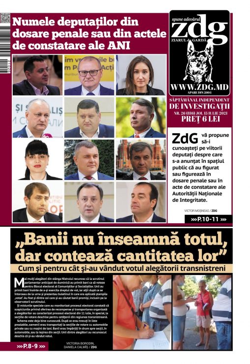 În ediția de mâine, 15 iulie, a Ziarului de Gardă citiți o anchetă despre cum și pentru cât și-au vândut votul alegătorii transnistreni. Mai mulți alegători din stânga Nistrului recunosc că la scrutinul parlamentar anticipat de duminică au primit bani ca să voteze pentru Blocul electoral al Comuniștilor și Socialiștilor. Unii au primit bani înainte de a-și exercita dreptul de vot, iar alții după ce se întorceau de la urne și prezentau buletinul în care era aplicată ștampila „votat”. Au fost și dintre cei care și-au căutat banii promiși, inclusiv pe la observatorii scrutinului.