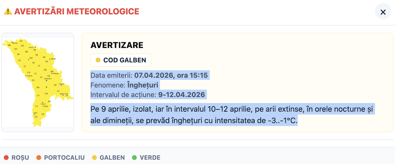 Pe 7 aprilie, SHS a anunțat Cod Galben de înghețuri pentru perioada 9-12 aprilie. Pe 9 aprilie, fenomenul va fi izolat, iar „în intervalul 10–12 aprilie, pe arii extinse, în orele nocturne și ale dimineții, se prevăd înghețuri cu intensitatea de -3-1°C”, a anunțat SHS pe 7 aprilie.