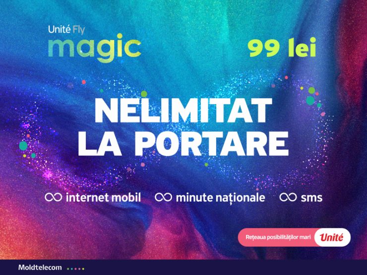 Unite este singurul operator care oferă un abonament Nelimitat PE BUNE – adică trafic internet mobil Nelimitat, SMS-uri și minute naționale NELIMITATE, minute în rețeaua Unite și Moldtelecom NELIMITATE, la doar 99 de lei! Poți să zbori. De asta și recomandăm Fly Magic.