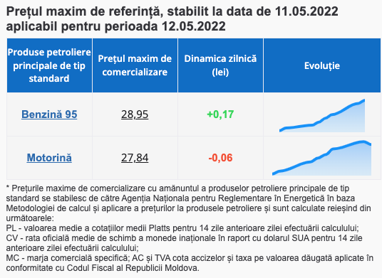 Preţurile maxime de comercializare cu amănuntul a produselor petroliere principale de tip standard se stabilesc de către ANRE în baza Metodologiei de calcul şi aplicare a preţurilor la produsele petroliere și sunt publicate zilnic pe site-ul Agenției, iar benzinăriile din țară trebuie să le afișeze de la miezul nopții.