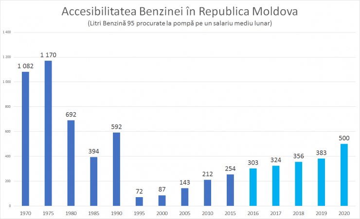 Expertul economic Veaceslav Ioniță susține că în anul 2020 benzina a devenit cu 30% mai accesibilă decât în anul precedent, când de un salariu mediu lunar puteau fi procurate doar 390 litri de benzină.