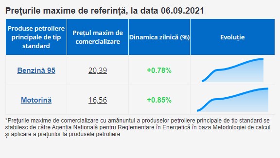 Agenția Națională pentru Reglementare în Energetică (ANRE) a stabilit luni, 6 septembrie, prețul de referință la carburanți, mai exact la produsele petroliere principale de tip standard – motorină și benzină, prețul constituind un plafon pentru toate stațiile de alimentare cu carburanți din țară.