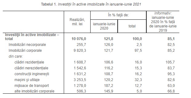 Conform BNS, în ianuarie-iunie 2021 investițiile în imobilizări corporale au constituit 9,8 miliarde lei (ceea ce constituie 97,5% din valoarea totală a investițiilor în active imobilizate), având o creștere de 21,7% față de aceeaşi perioadă a anului precedent. Investițiile în imobilizări necorporale au constituit 255,7 milioane lei sau cu 26,0% mai mult față de ianuarie-iunie 2020.