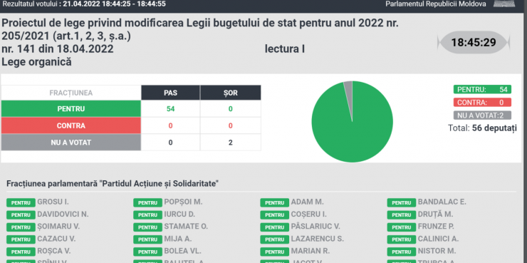Proiectul de lege privind modificarea Legii bugetului de stat pentru anul 2022 a fost votat de Parlament în prima lectură, în cadrul ședinței Parlamentului de joi, 21 aprilie.