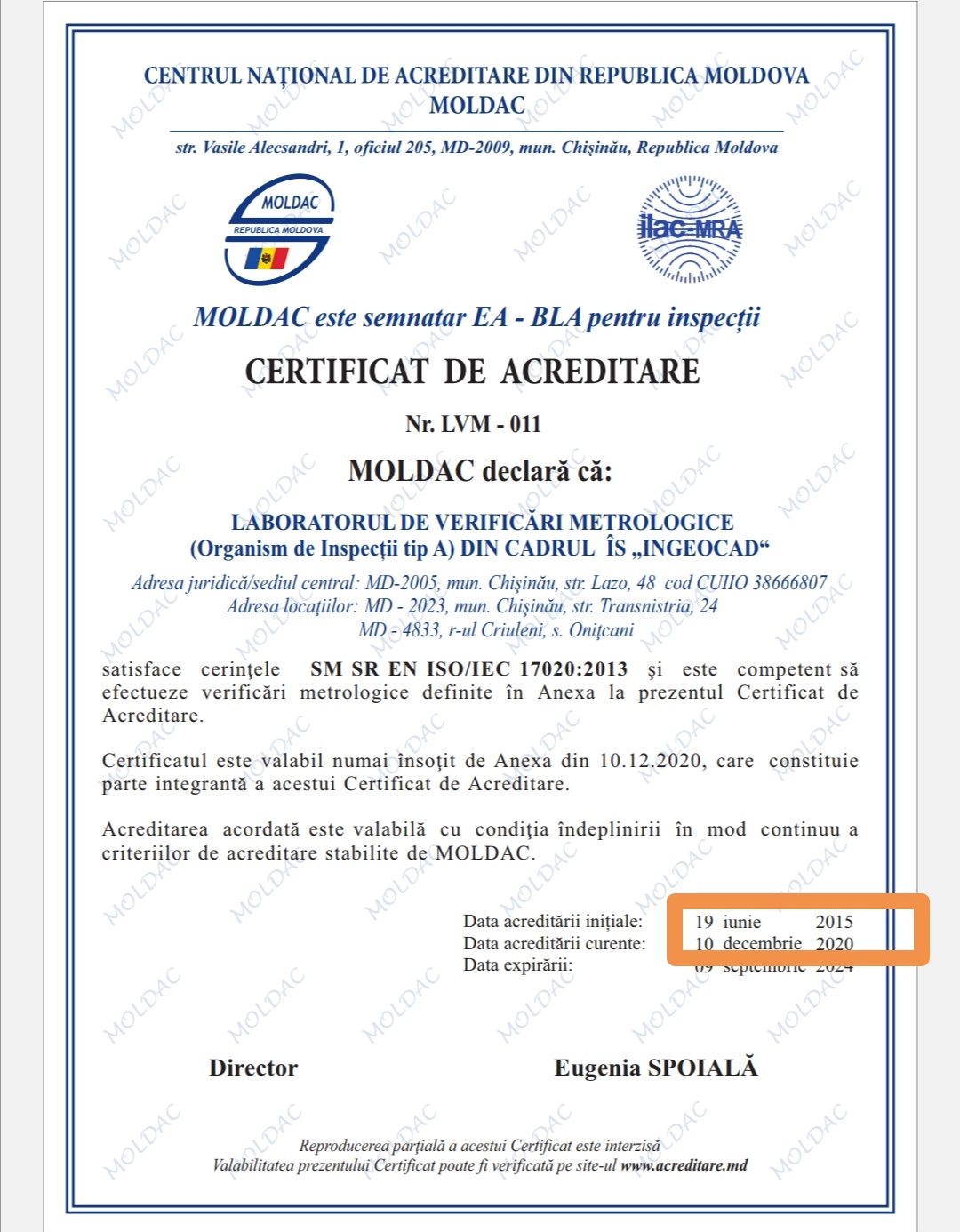 În 2015, Laboratorului de Verificări Metrologice din cadrul Întreprinderea de Stat „INGEOCAD” a primit acreditare să efectueze verificări metrologice. Certificatul a fost obținut pe o perioadă de 5 ani, expirând în 2020.