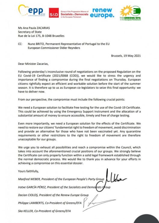 Liderii grupurilor politice din Parlamentul European au trimis o scrisoare comună către președinția portugheză a Consiliului UE, în care își declară îngrijorarea privind blocarea negocierilor dintre statele membre pentru propunerea de regulament asupra certificatului european COVID-19, așa-numitul pașaport verde. Ei propun o serie de soluții pentru obținerea unui consens, printre care și testarea gratuită, pentru a nu-i discrimina pe cei nevaccinați. Dacian Cioloș, președintele grupului Renew Europe și unul dintre semnatarii scrisorii, a postat un mesaj pe pagina lui de Facebook, în care anunță despre acest fapt.