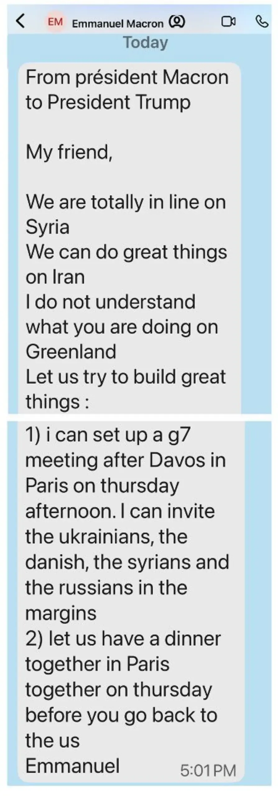 „De la președintele Macron către președintele Trump. Prietenul meu, Suntem complet aliniați în privința Siriei. Putem face lucruri mari în privința Iranului. Nu înțeleg ce faci în Groenlanda. Să încercăm să construim lucruri mari: