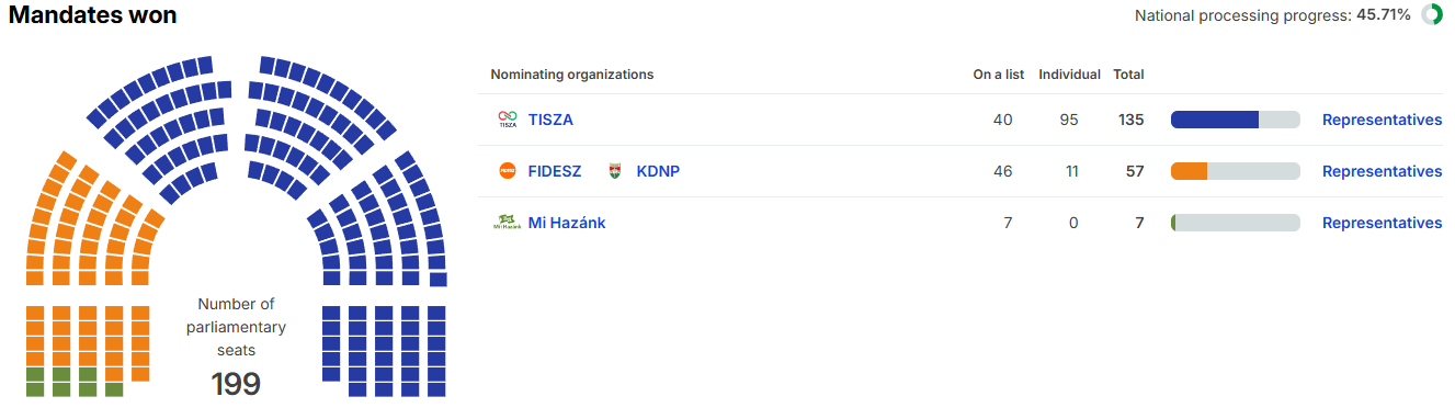 UPDATE 22:39 Numărul de mandate continuă să crească pentru partidul Tisza. După procesarea a 66,69% din procesele-verbale, Tisza, partidul lui Magyar, ar obține 137 de mandate în Parlamentul de la Budapesta, în timp ce partidul condus de Orbán, Fidesz, este creditat cu 55 de mandate.