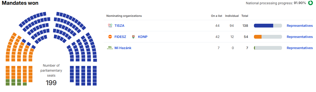 UPDATE 22:18 După procesarea a 53,45% din procesele-verbale, Tisza, partidul lui Magyar, ar obține 136 de mandate în Parlamentul de la Budapesta, în timp ce partidul condus de Orbán, Fidesz, este creditat cu 56 de mandate. Acest rezultat i-ar aduce formațiunii Tisza o majoritate de două treimi, trecând pragul minim de 133 de mandate.