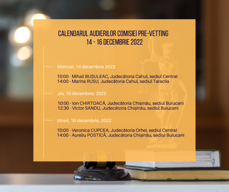 Comisia independentă de evaluare a integrității candidaților la funcția de membru în organele de autoadministrare ale judecătorilor și procurorilor (Comisia pre-vetting) a anunțat calendarul audierilor publice pentru perioada 14-16 decembrie 2022.