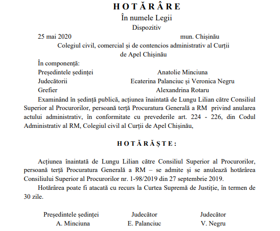 O hotărâre în acest sens a fost emisă la 25 mai de către CA Chișinău, magistrații precizând că admit acțiunea înaintată de Lilian Lungu și anulează hotărârea CSP-ului din septembrie.