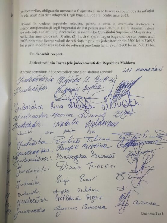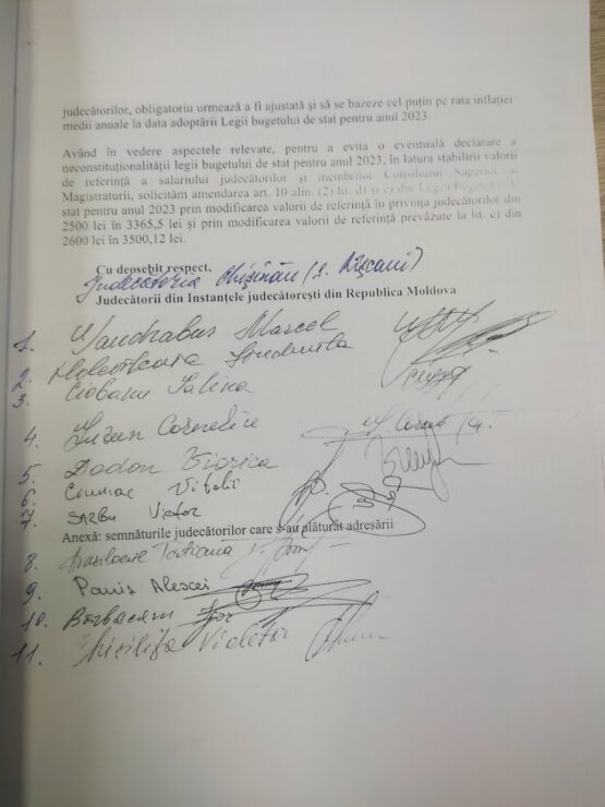 Reieșind din prevederile hotărârii Curții Constituționale, menționate supra, mărimea valorii de referință pentru calcularea, începând cu 1 ianuarie 2023, a salariilor judecătorilor, obligatoriu urmează a fi ajustată și să se bazeze cel puțin pe rata inflației medii anuale la data adoptării Legii bugetului de stat pentru anul 2023”, potrivit demersului judecătorilor.
