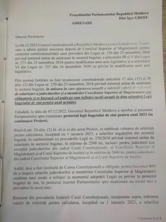 „Deși a fost instituită de Curtea Constituțională o obligație pentru Guvernul R. Moldova de a majora salariile judecătorilor și membrilor Consiliului Superior al Magistraturii conform ratei medii a inflației la momentul adoptării Legii cu privire la proiectul bugetului de stat, în proiectul înaintat Parlamentului spre examinare nu există nicio prevedere în acest sens.