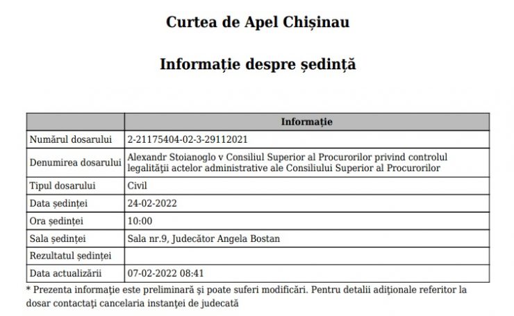 Ședința este programată pentru data de 24 februarie, cu începere de la ora 10:00, la Curtea de Apel Chișinău.