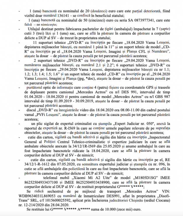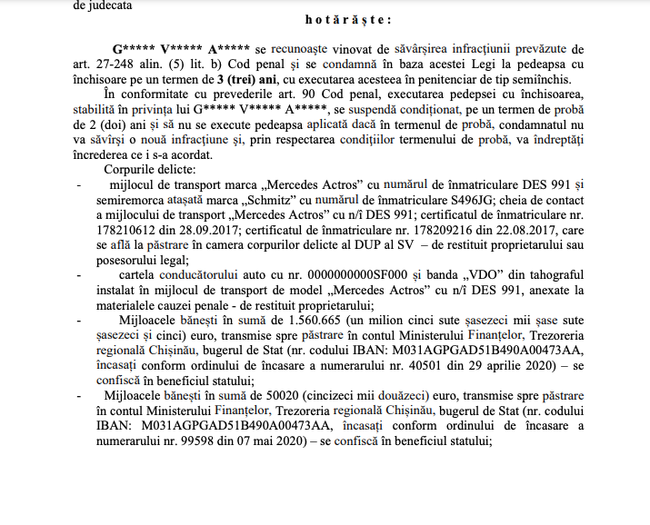 În sentința de condamnare, care conține 23 de file, pe majoritatea foilor se regăsesc mărturiile detaliate ale șoferului despre cum a ajuns să transporte banii capturați în primăvara anului 2020 de vameșii de la frontiera Leușeni.