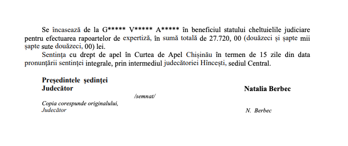 Sentința integrală a fost emisă de magistrata Natalia Berbec la 15 aprilie curent, cu o zi înainte de anunțul PCCOCS.