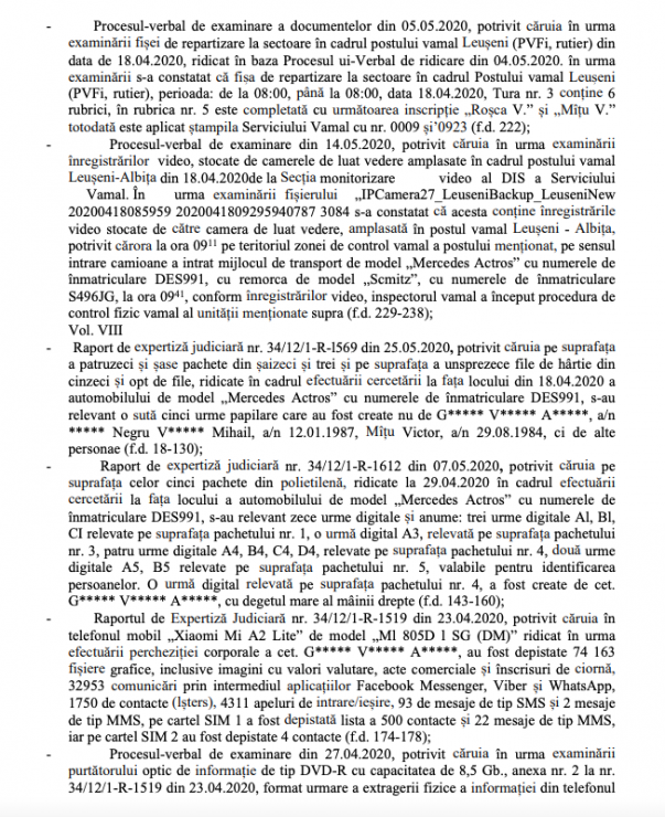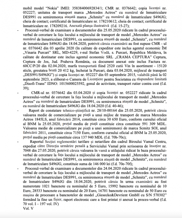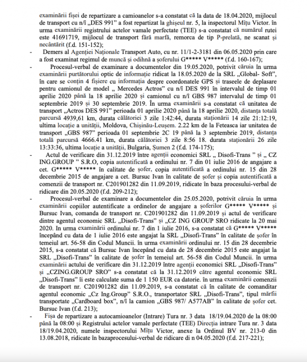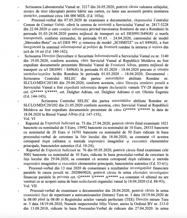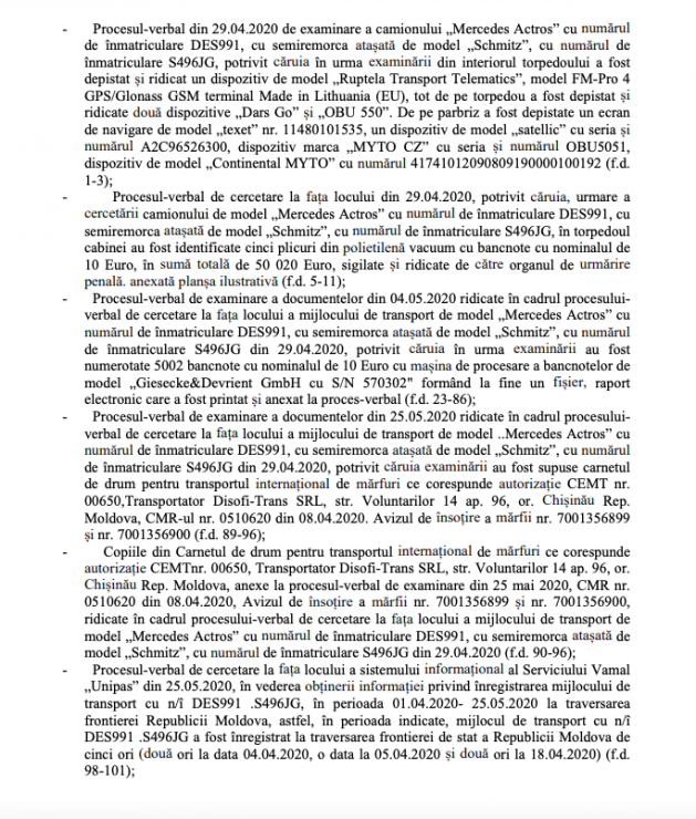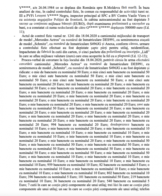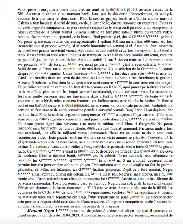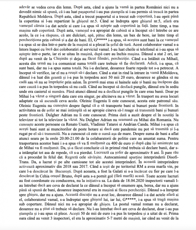 În documentul care conține 23 de file se regăsesc declarațiile șoferul camionului, condamnat în cazul capturii de 1,5 milioane de euro nedeclarați la vama Leușeni. Acesta a povestit în instanța de judecată cum a ajuns să transporte banii capturați. Șoferul camionului le-a povestit judecătorilor, în detalii, cine i-a dat banii, de unde i-a luat și unde urmau să ajungă.