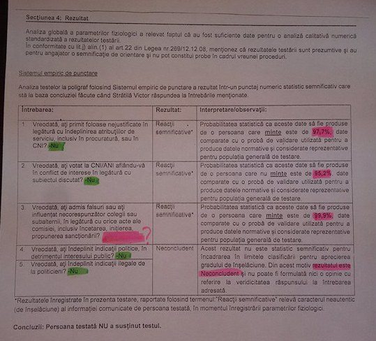 „La întrebarea nr.2, deși poligrafologul susține că am mințit cu o probabilitate de 95,2 %, injustețea acestuia poate fi confirmată cu baza de date a CNI pe cazurile de conflicte de interese din care se relevă elocvent faptul că nu am participat la nici o procedură de vot, în care subiect al controlului ar fi fost rude apropiate sau care ar fi avut tangențe cu acestea”, precizează Victor Strătilă.