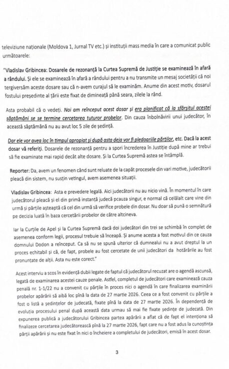 Mai exact, avocații invocă că Gribincea a declarat presei, în cadrul Adunării Generală a Judecătorilor din 27 martie, că „a reînceput acest dosar și era planificat ca la sfârșitul acestei săptămâni se se termine cercetarea tuturor probelor”.