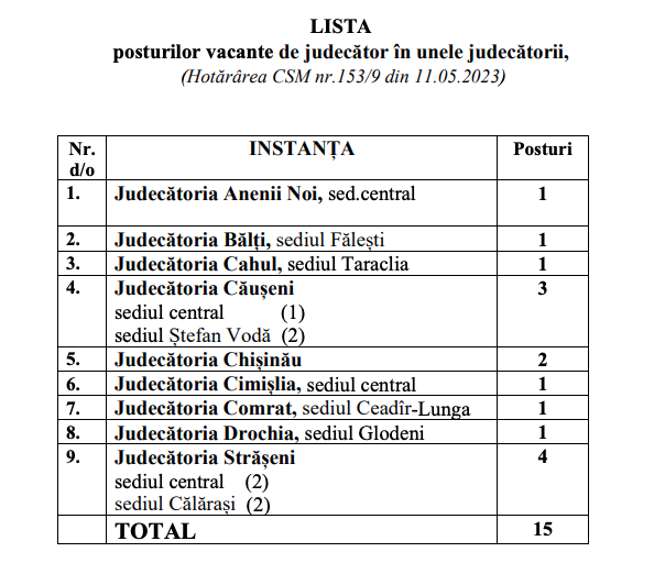 Pe agenda şedinţei plenului Consiliului Superior al Magistraturii (CSM), stabilită pentru zilele de 16 și 17 noiembrie, există un singur subiect: „Desfășurarea concursului pentru suplinirea funcțiilor vacante de judecător în unele judecătorii”. Membrii CSM urmează să examineze, conform listei anexate, 86 de candidați, deși sunt doar 15 locuri vacante.