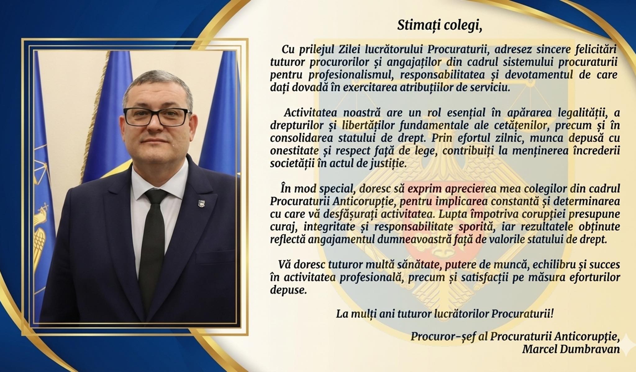 „Munca în procuratură este mai mult decât o profesie — este o vocație, care cere nu doar competență juridică, ci și echilibru, curaj și atașament față de valorile statului de drept. Faptul că, zi de zi, contribuiți la combaterea criminalității, la asigurarea legalității și la înfăptuirea justiției conferă un sens profund activității pe care o desfășurați. Vă doresc sănătate, echilibru, putere de muncă și încrederea că eforturile dumneavoastră contează și sunt apreciate. Să aveți parte de respect, sprijin și satisfacția lucrului bine făcut”, le-a transmis colegilor Alexandru Machidon.