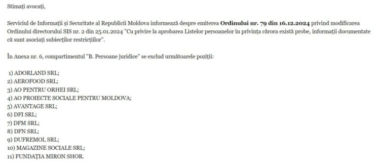Anterior, un avocat a scris pe rețelele de socializare că „de la Uniunea Avocaților a venit pe mail o informație precum că SIS a exclus din lista de sancțiuni mai multe persoane juridice afiliate cu Șor”. Acesta a publicat și o imagine cu mesajul primit.