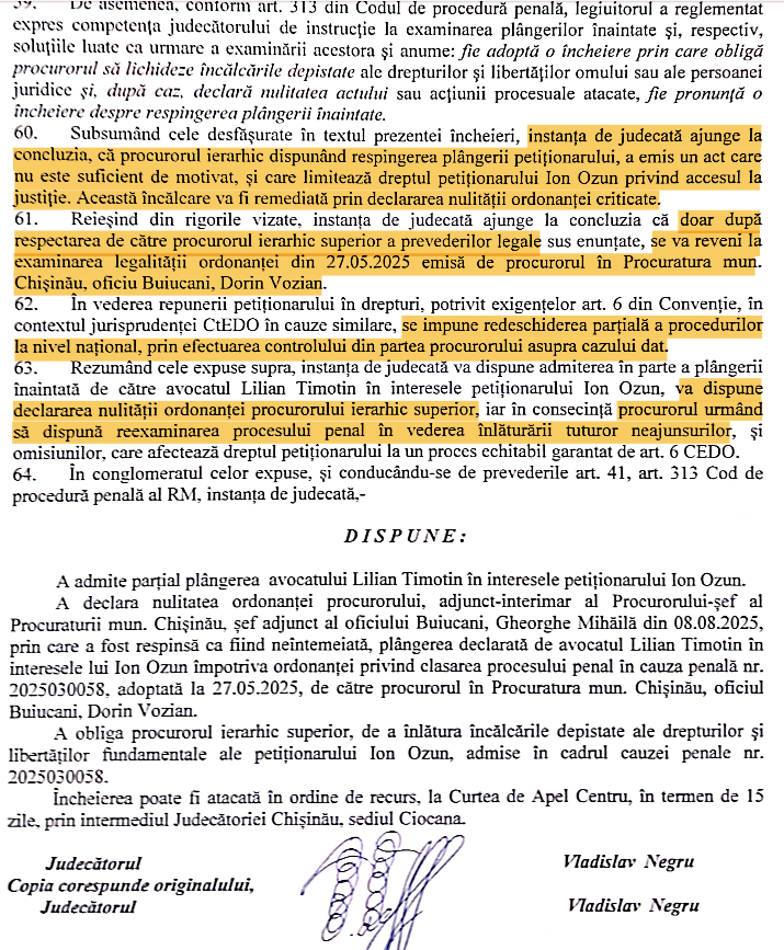 Procurorul ierarhic superior nu a dat curs cererii familiei Ozun, menținând clasarea cauzei penale. Avocatul Lilian Timotin s-a adresat în instanță. În cele din urmă, Judecătoria Chișinău, Sediul Ciocana, a admis parțial cererea, iar ordonanța procurorului ierarhic superior a fost declarată nulă: „Instanța de judecată constată că procurorul ierarhic, respingând plângerea depusă de petiționar, a emis un act insuficient motivat, care a limitat dreptul lui Ion Ozun de acces la justiție. Această încălcare este remediată prin declararea nulității ordonanței contestate.” Instanța de judecată a considerat că procurorul ierarhic superior „a examinat superficial plângerea” depusă de avocatul Lilian Timotin și „a dispus nejustificat respingerea” acesteia. Ordonanța emisă a fost apreciată ca fiind „formală și neîntemeiată”. Pe 16 octombrie, ancheta a fost reluată, iar dosarul de urmărire penală a fost expediat înapoi la IP Buiucani. ZdG a solicitat detalii de la poliție despre mersul anchetei, dar instituția nu a răspuns în termenul legal de 10 zile de la recepționarea cererii.