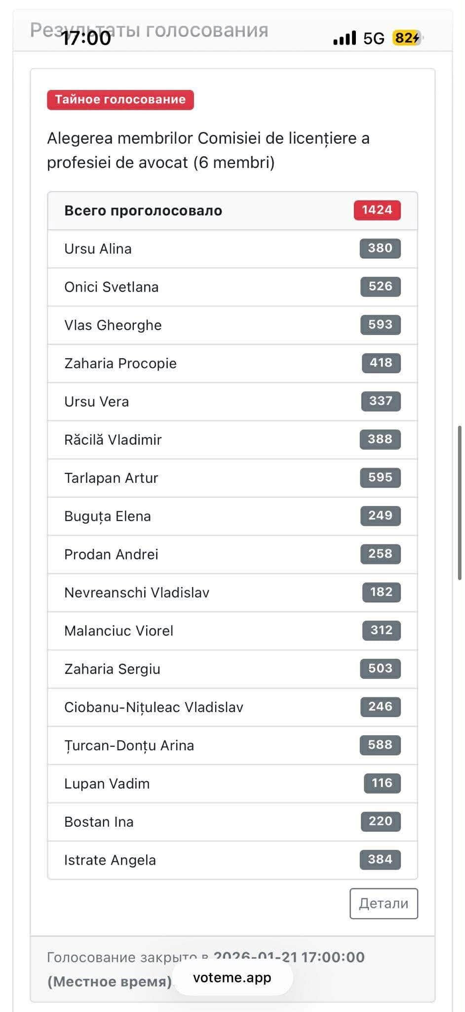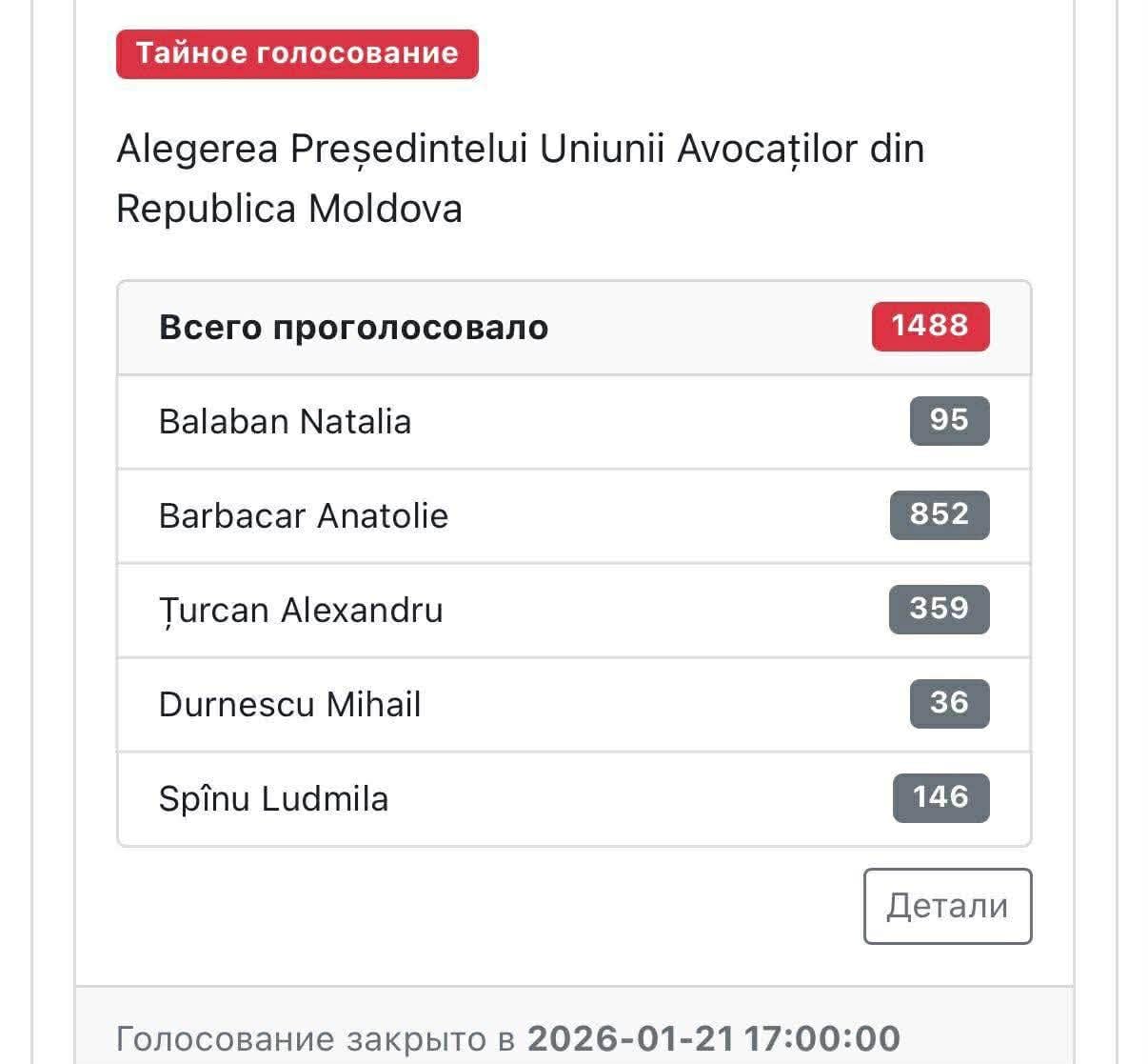 Pentru funcția de președinte al Uniunii au candidat 5 avocați: Natalia Balaban, Anatolie Barbacar, Alexandru Țurcan, Mihail Durnescu și Ludmila Spînu. Procesul de votare în cadrul Congresului Uniunii Avocaților din R. Moldova s-a încheiat la data de 21 ianuarie, la ora 17:00.