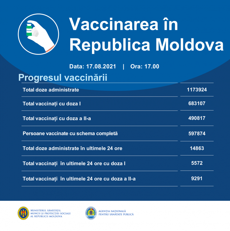 14 863 de persoane s-au vaccinat împotriva COVID-19 în ultimele 24 de ore. Dintre acestea, 5 572 de persoane au fost vaccinate cu prima doză, iar 9 291 de persoane au fost imunizate cu a doua doză, anunță marți Ministerul Sănătății, Muncii și Protecției Sociale (MSMPS).