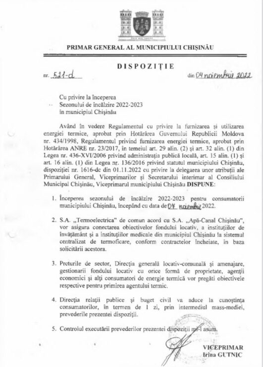 Începând de astăzi, în capitală va fi livrat agent termic pentru toți consumatorii din municipiu. Șeful Direcției generale locativ-comunale și amenajare, Ion Burdiumov, a declarat în cadrul ședinței operative săptămânale de la primărie, că până la finele săptămânii curente, agentul termic va ajunge în toate apartamentele, la solicitarea gestionarilor fondului locativ.