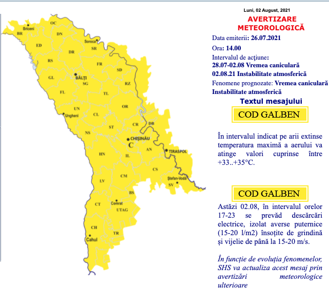 Specialiștii de la Serviciul Hidrometeorologic de Stat (SHS) au prelungit până cel puțin luni, 2 august, codul galben de caniculă, iar în același timp au emis o un alt codul galben de instabilitate atmosferică. Ambele coduri sunt valabile pe întreg teritoriu al R. Moldova.
