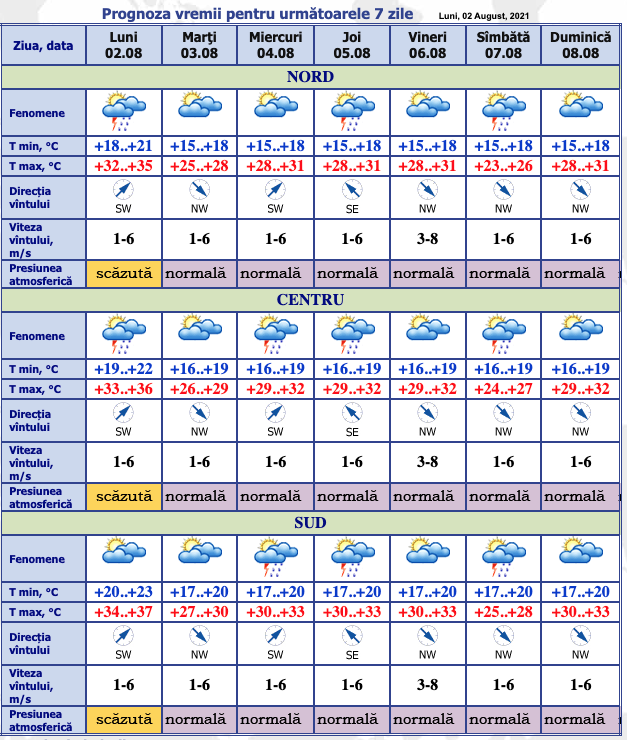 Meteorologii avertizează că în unele regiuni vom avea temperaturi de 37 de grade Celsius, în țară media fiind de 35 de grade și tot astăzi în intervalul orelor 17:00 – 23:00 se prevăd descărcări electrice, izolat averse puternice (15-20 l/m2) însoțite de grindină și vijelie de până la 15-20 m/s, în toate regiunile țării.