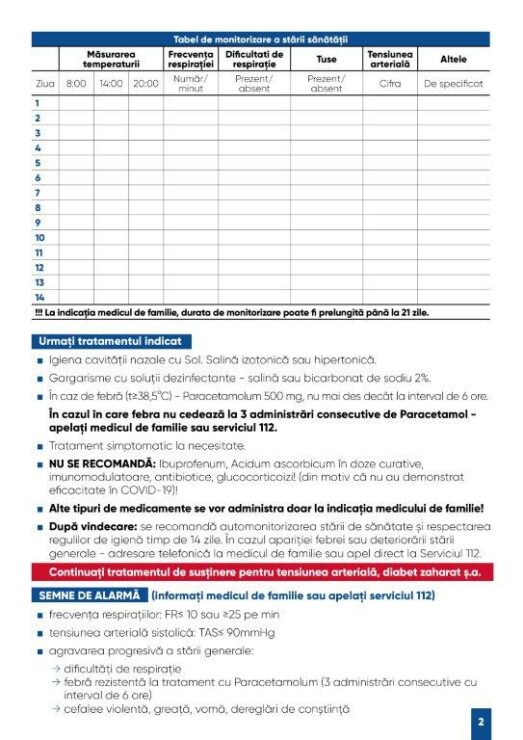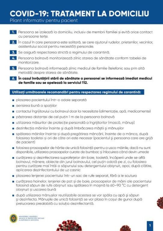 Șefa Direcției politici în domeniul asistenței medicale primare, urgente și comunitare, Tatian Zatîc, a precizat, în cadrul briefingului de dimineață, că „medicii de familie se ghidează în selectarea pacienților pentru tratament la domiciliu de către criteriile stabilite în Protocolul clinci standardizat pentru medicii de familie, care spune foarte clar în care cazuri medicul de familie poate trata pacientul la domiciliu și în care cazuri sunt criterii clare pentru spitalizare”.